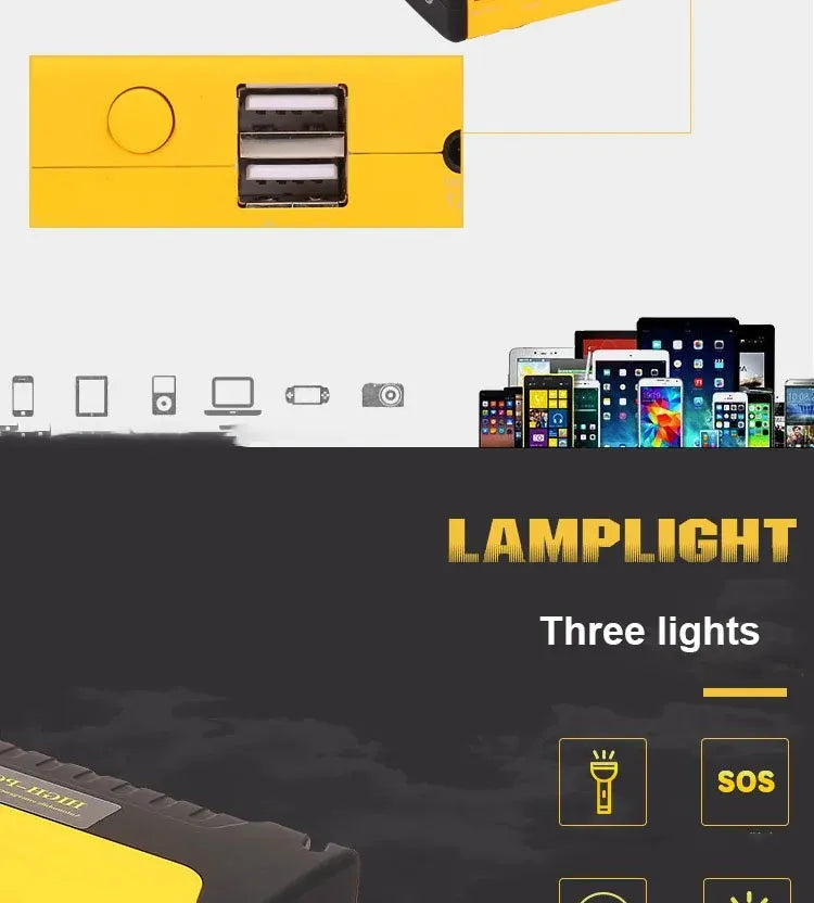 Este completo kit de encendido portátil es una herramienta indispensable para cualquier conductor. Su potente batería de polímero de litio permite arrancar vehículos en situaciones de emergencia, además de servir como cargador portátil para diversos dispositivos electrónicos. Con funciones de seguridad y diseño resistente, es ideal para viajes, emergencias y uso diario.